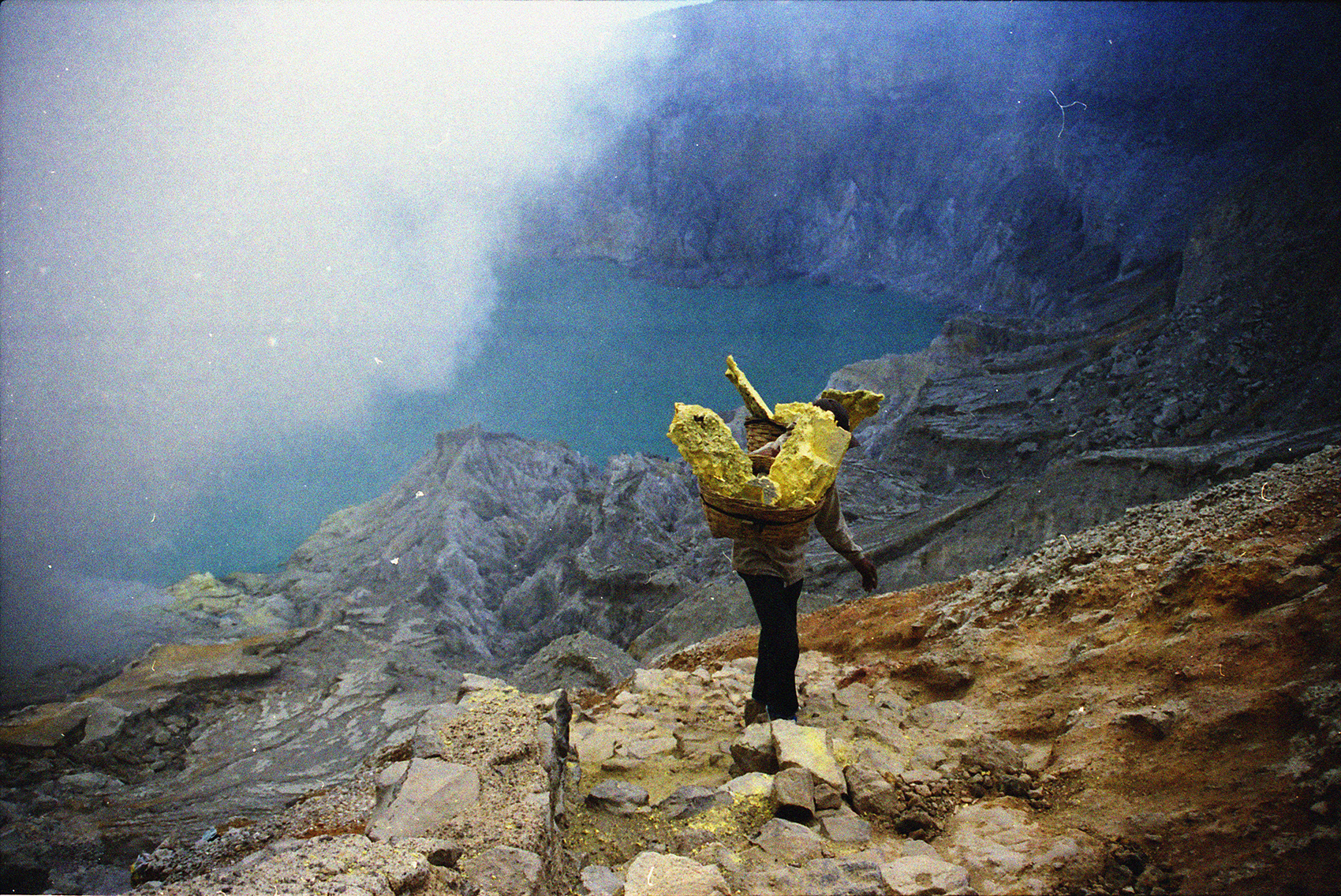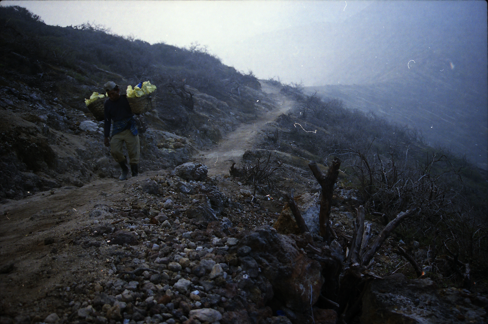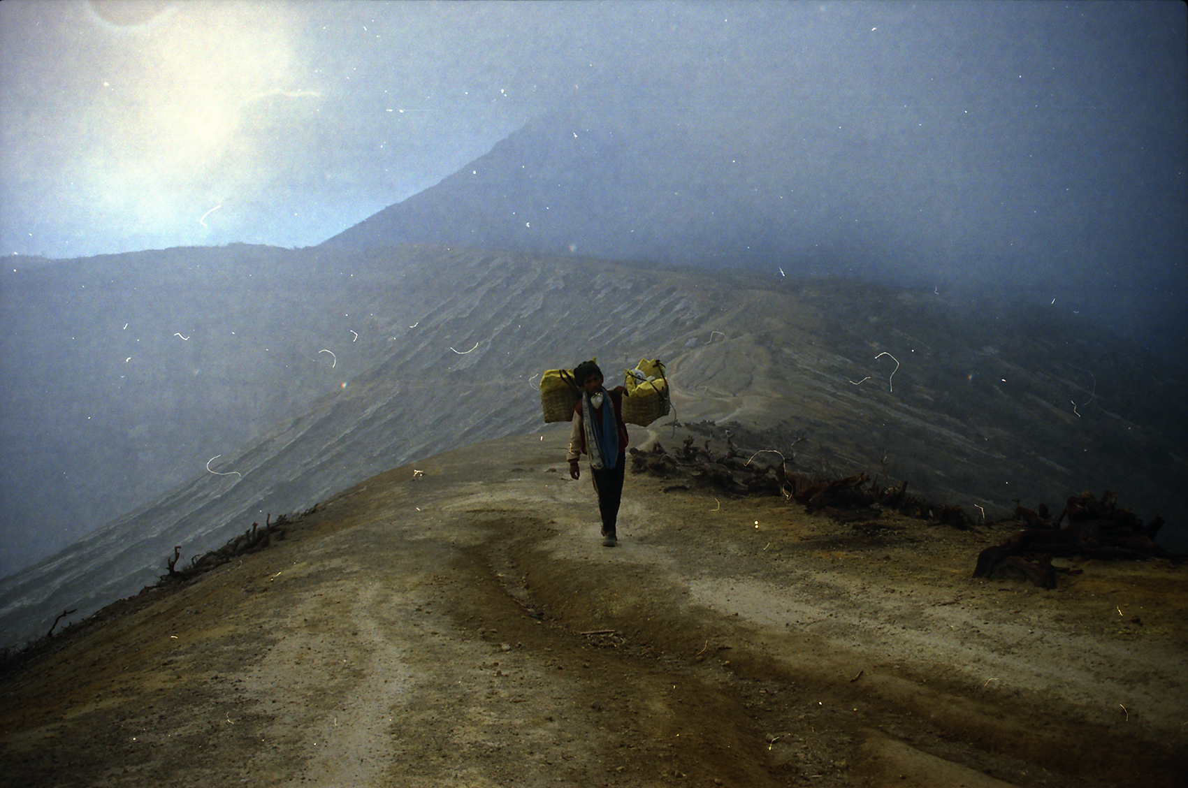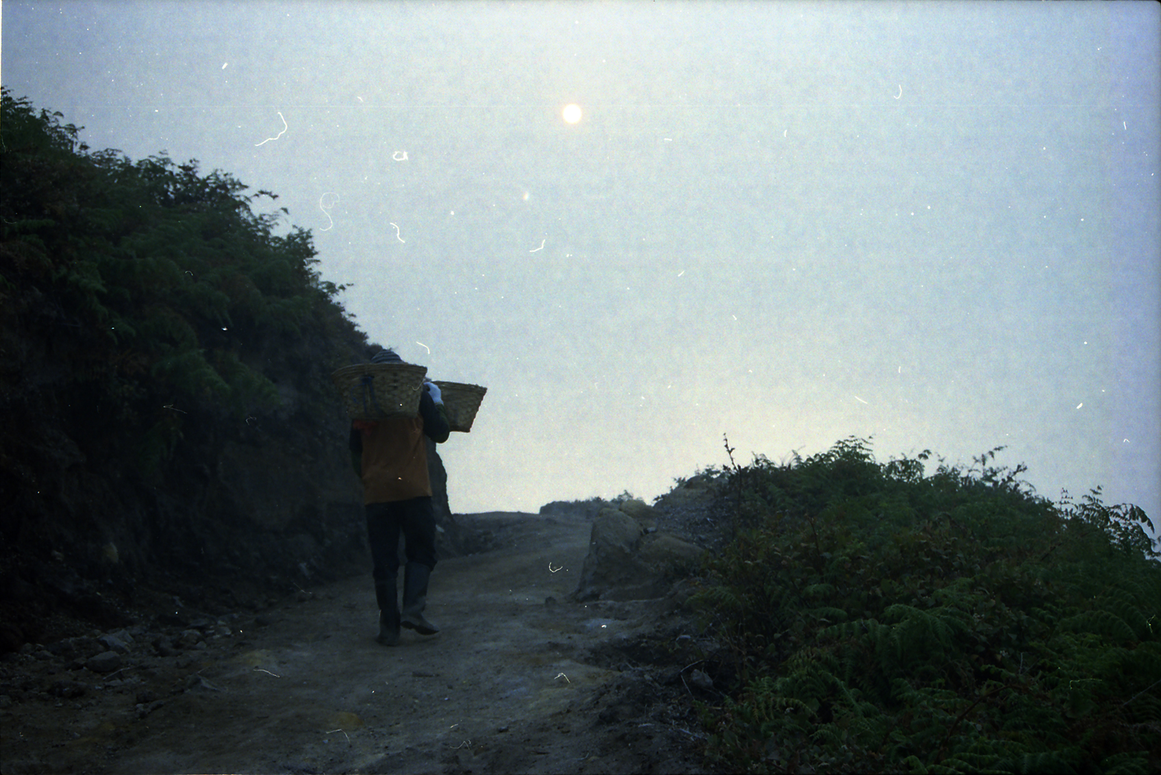 Everyday at the sunrise, workers go for a long walk up to the mountain. To pick up sulfur, they're going inside of the volcano's crater and going back with around 70kg of sulfur on their back.