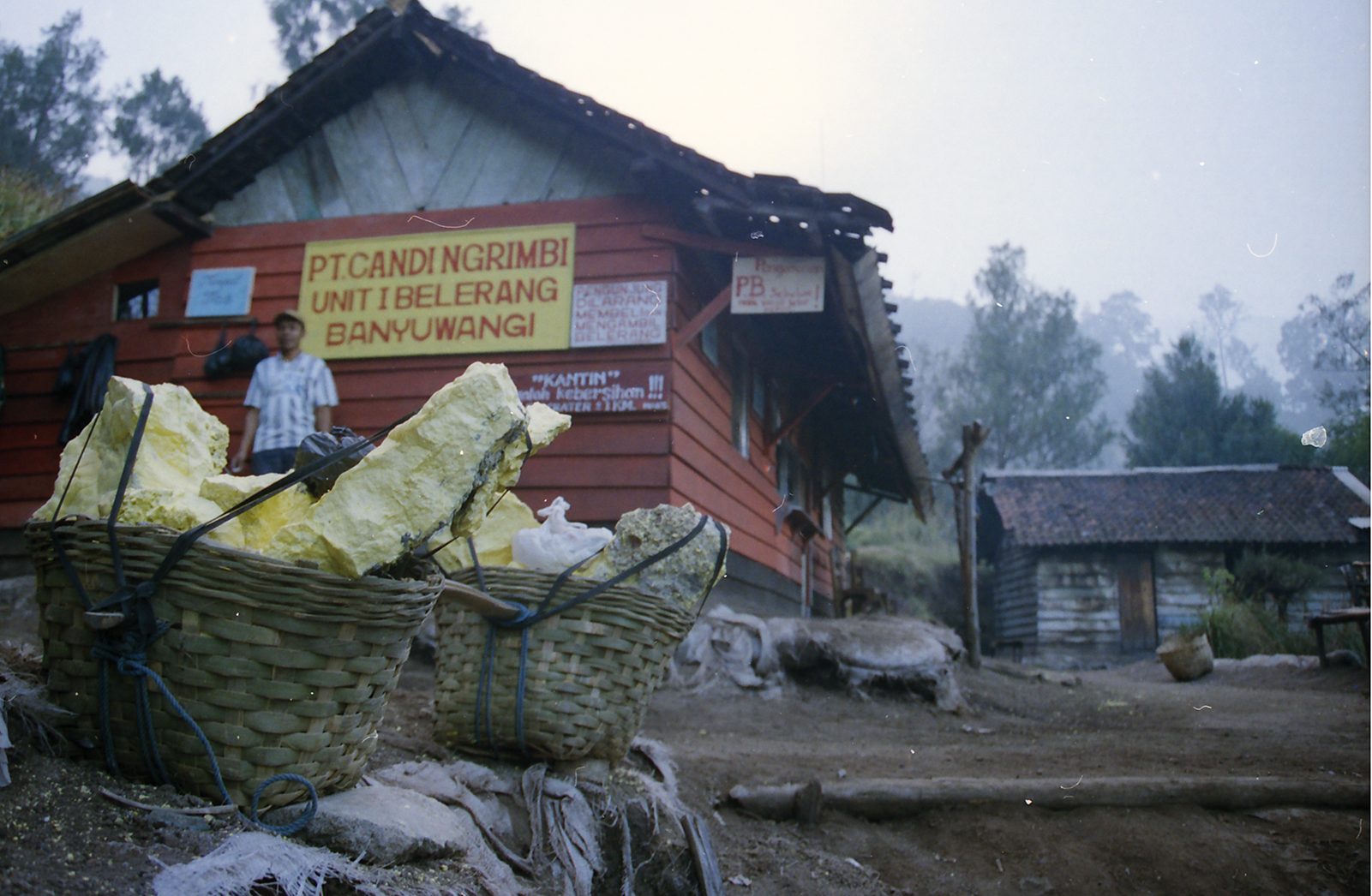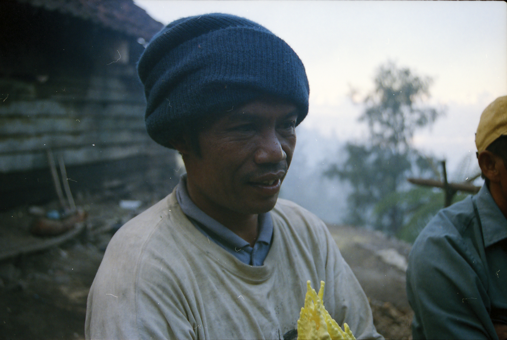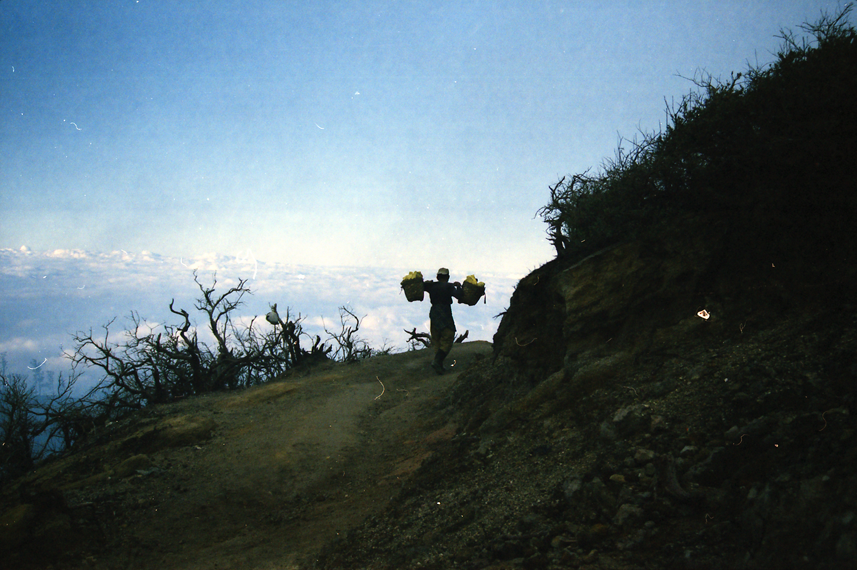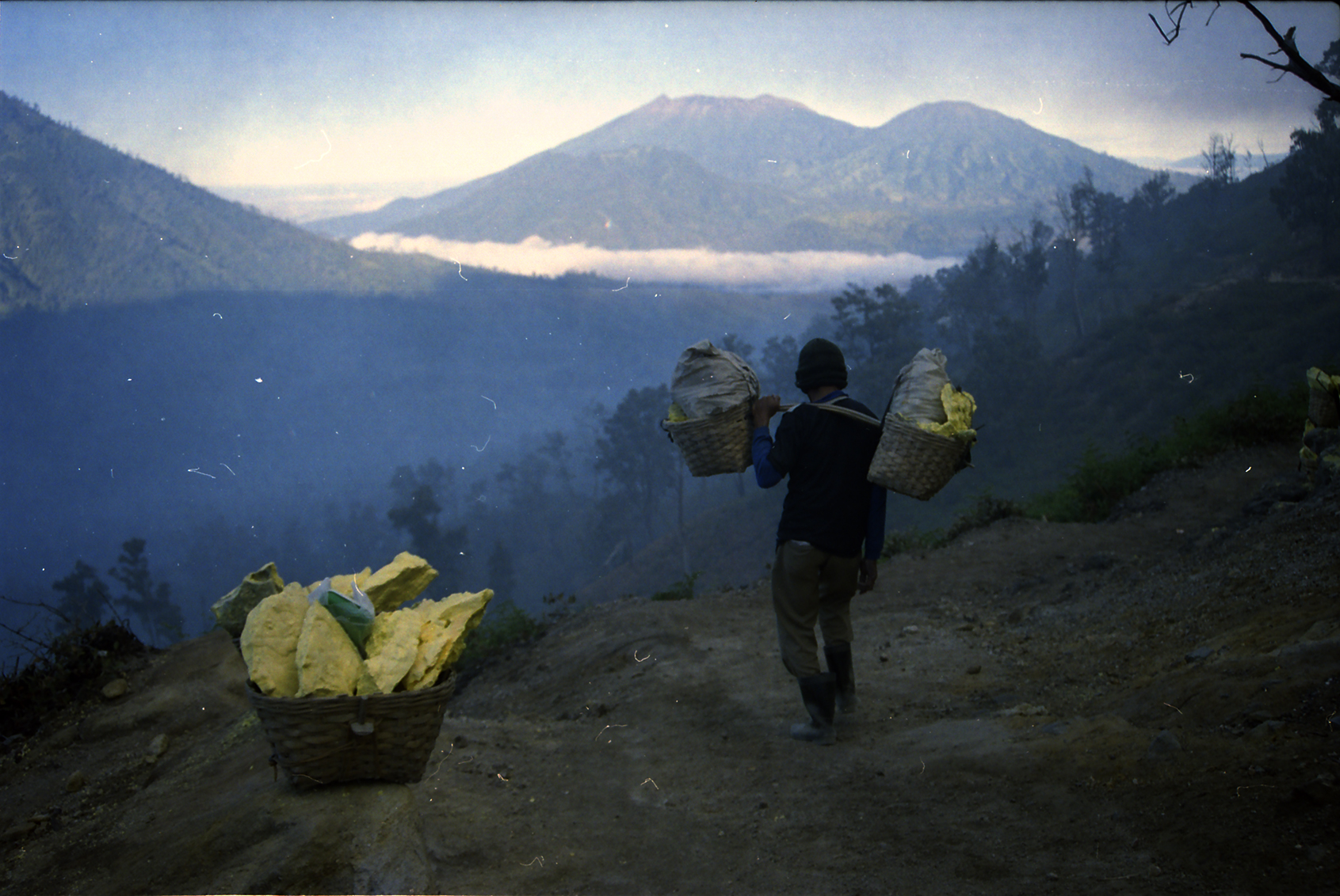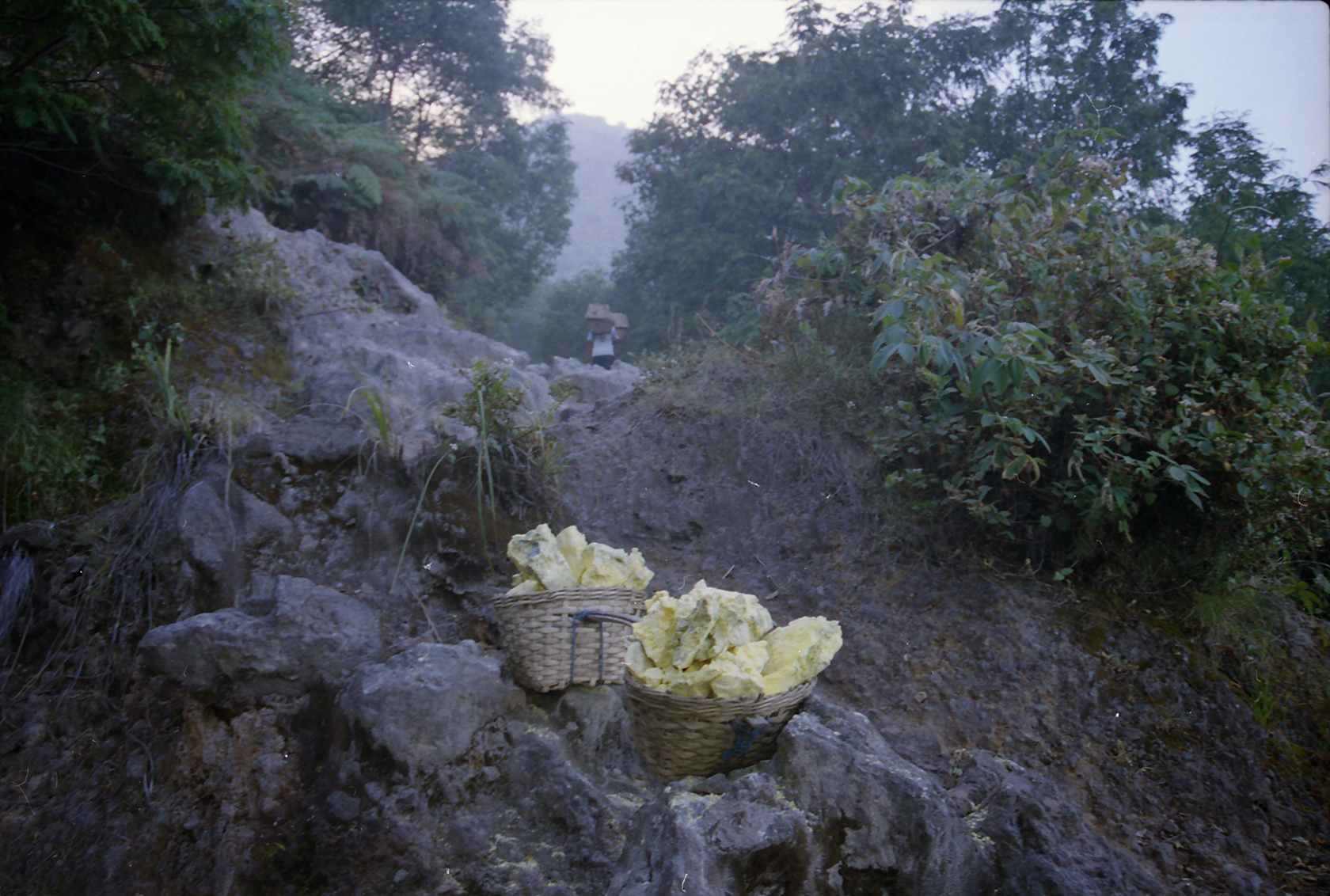 Everyday at the sunrise, workers go for a long walk up to the mountain. To pick up sulfur, they're going inside of the volcano's crater and going back with around 70kg of sulfur on their back.